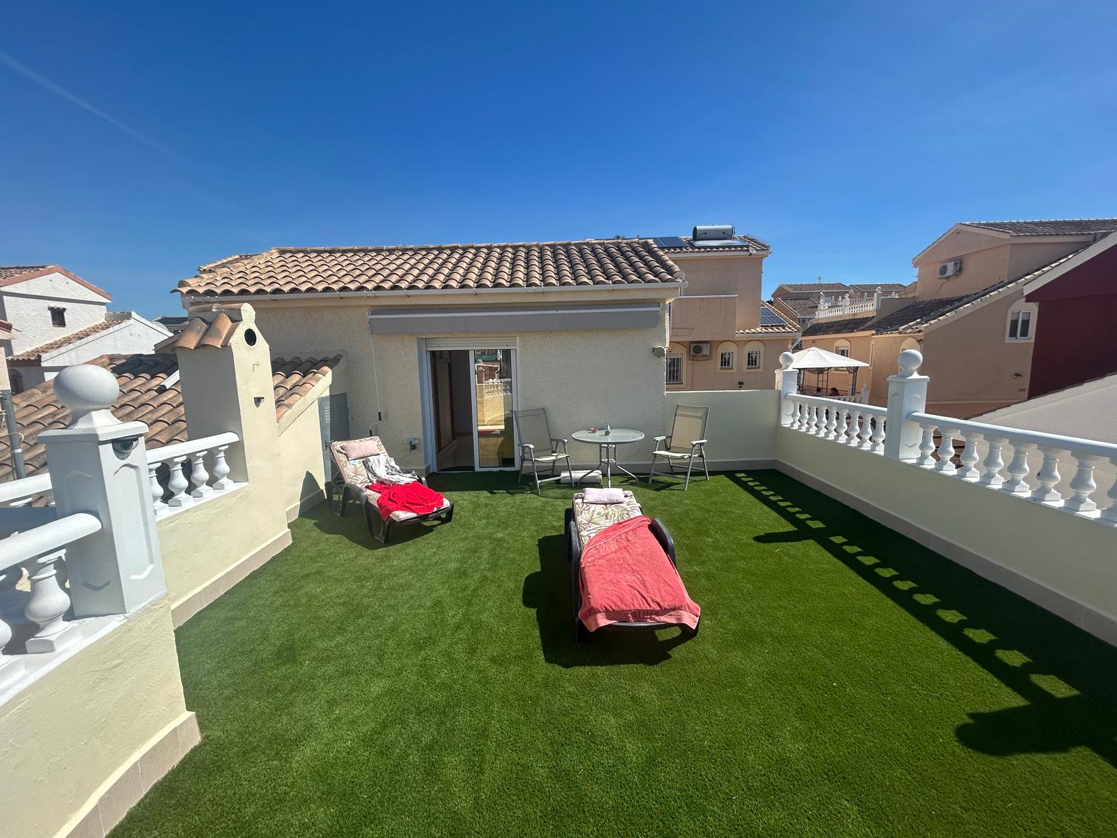 On the first floor, accessed via an external staircase (a characteristic feature of Neptune villas), you will find a private guest suite complete with its own en-suite bathroom. This space opens onto an impressive 50 m² terrace with artificial grass, providing a fantastic area for sunbathing, entertaining, or simply enjoying the uninterrupted mountain views.